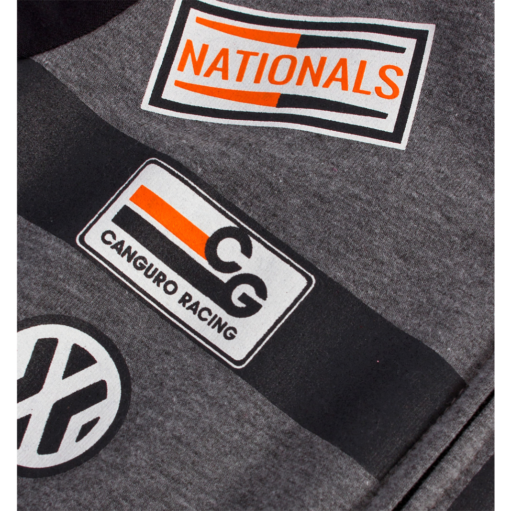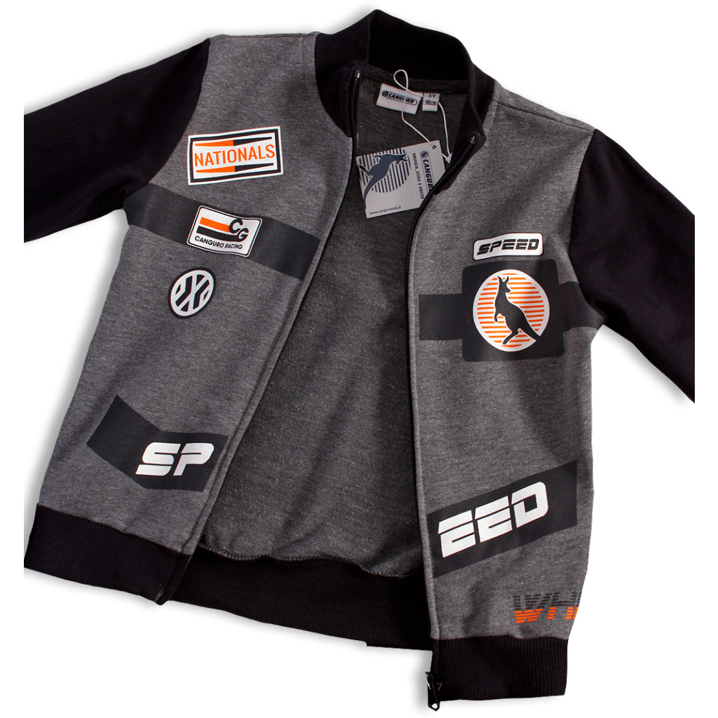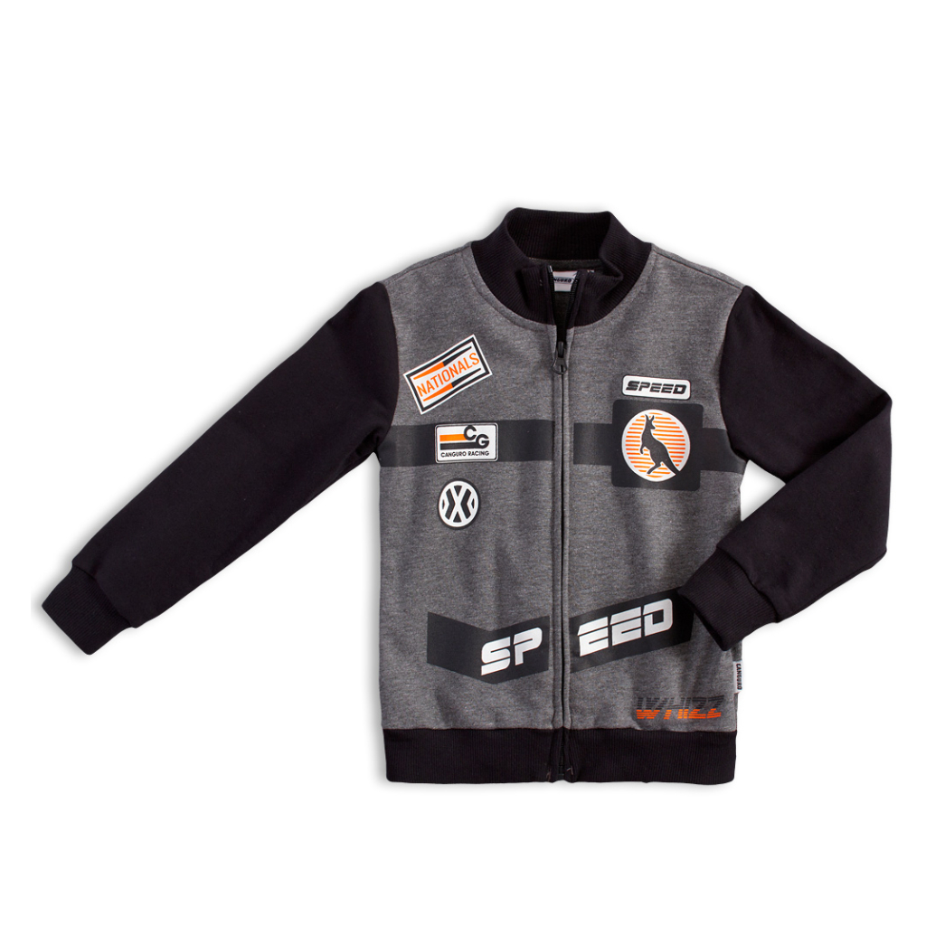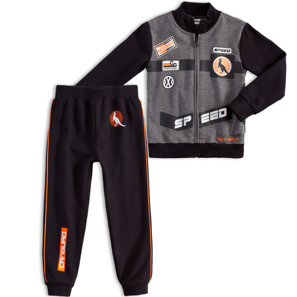 Chlapčenská tepláková súprava. Mikina bez kapucne, na zips. S potlačou. Tepláky s kontrastným prúžkom na bokoch. V páse guma, na nohaviciach pružné patenty. Vzadu našité vrecko.