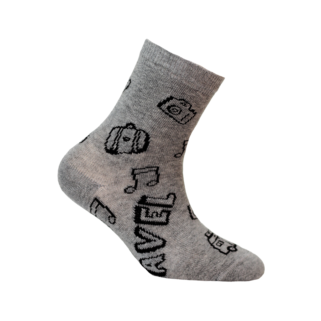 Detské vzorované ponožky. Príjemný elastický materiál, perfektne sedí na nohe. Ploché švy. Vypletený vzor s cestovateľským motívom. Certifikát OEKOTEX 100. Výrobca WOLA.