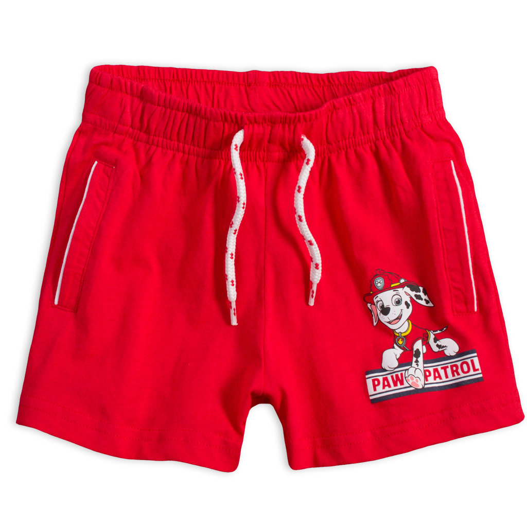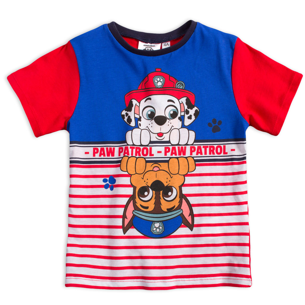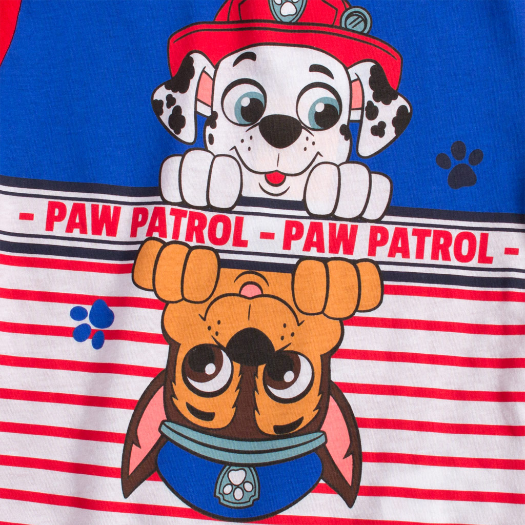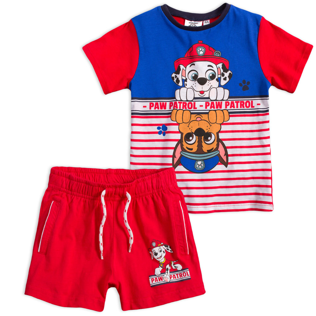 Chlapčenská letná súprava - tričko s krátkym rukávom a šortky. Potlač Labkovej patroly. Šortky sú v páse na gumu, šnúrka ozdobná. So všitými vreckami. Pružný bavlnený úplet.