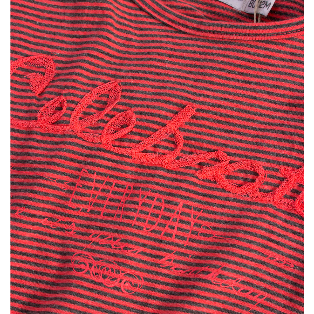 Dievčenské tričko, dlhý rukáv. Vpredu potlač a našitý nápis. Dole našitá mašlička. Rukávy i spodný okraj do tenkej gumičky. Príjemný pružný úplet. Na ramene zapínanie na gombíčky.