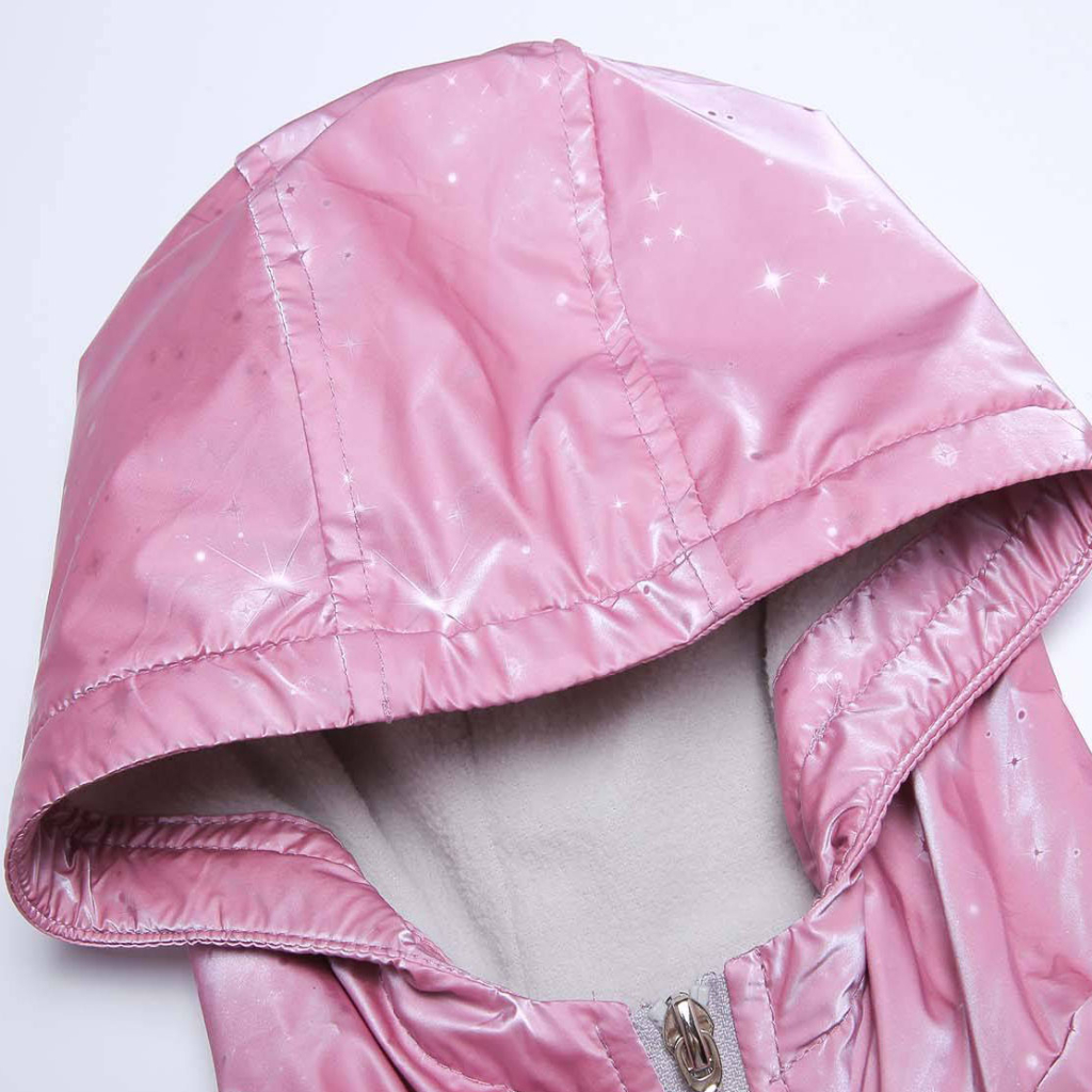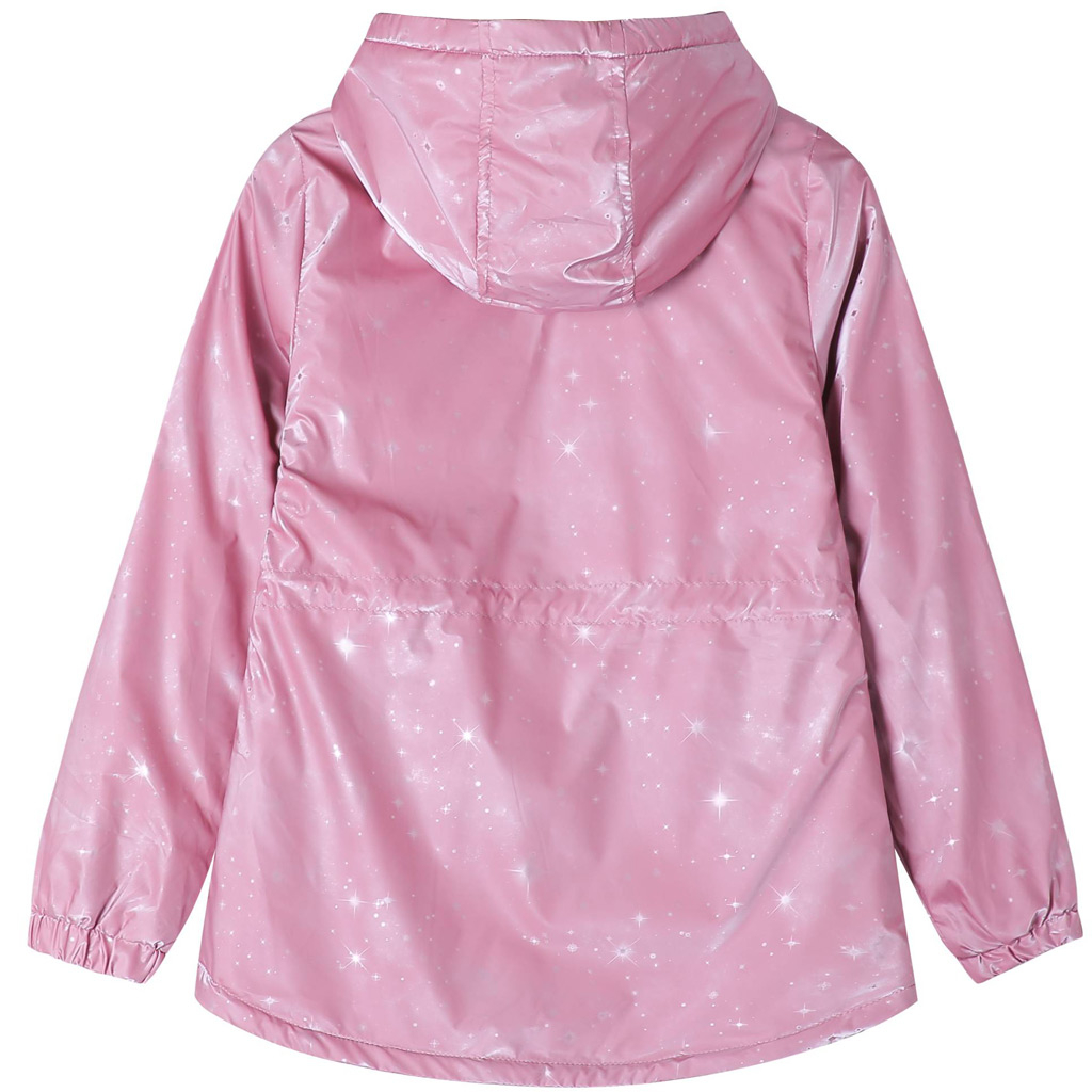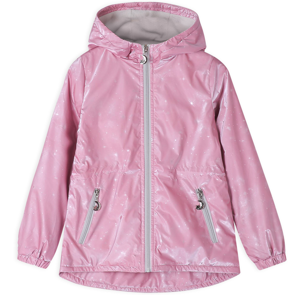 Dievčenské zateplená bunda na prechodné obdobie. S kapucňou, hlboké vrecká na zips. V páse možnosť stiahnutia. Predĺžený zadný diel. Flísová podšívka.