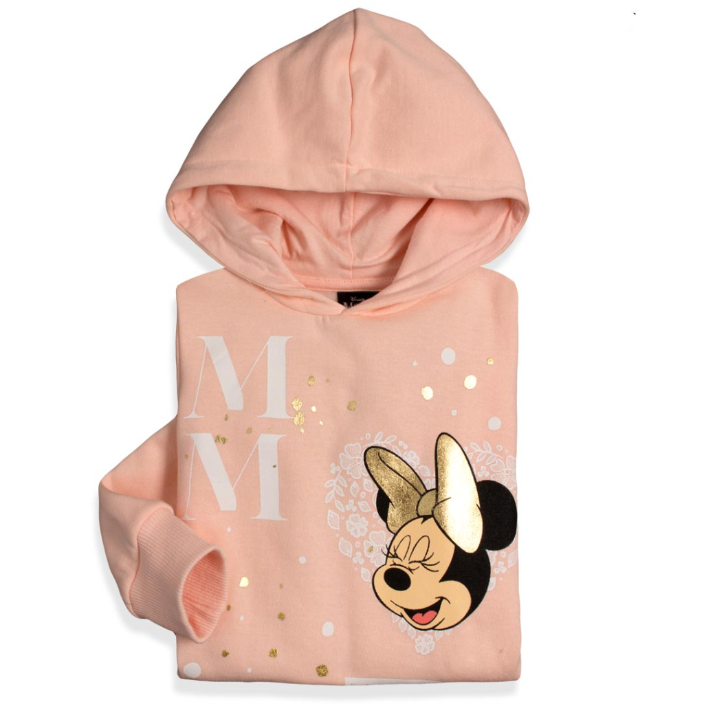 Dievčenská mikina s myškou Minnie. S kapucňou, bez zapínania. Pružné patenty. Potlač so zlatými detailmi. Teplákovina s jemným chĺpkom na rubovej strane.