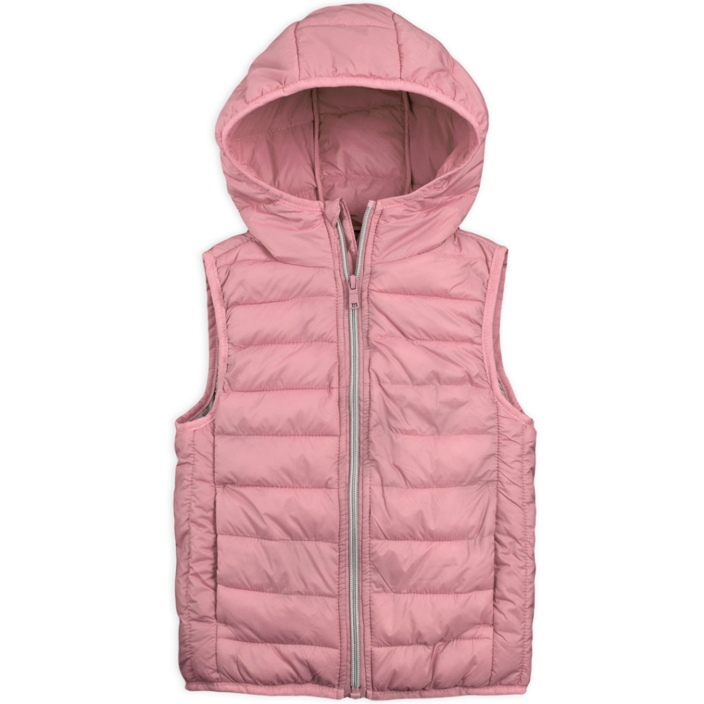 Ľahká dievčenská prešívaná vesta bez potlače. S kapucňou, stojačik pri krku. Hlboké vrecká.