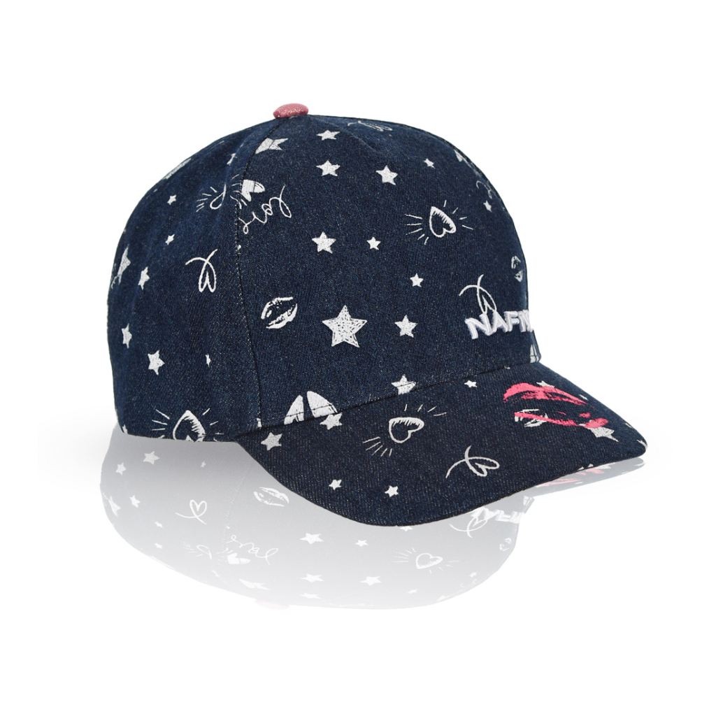 Dievčenská šiltovka z tmavo modrej džínsoviny s potlačou. Pevný šilt. Vzadu zapínanie na suchý zips.