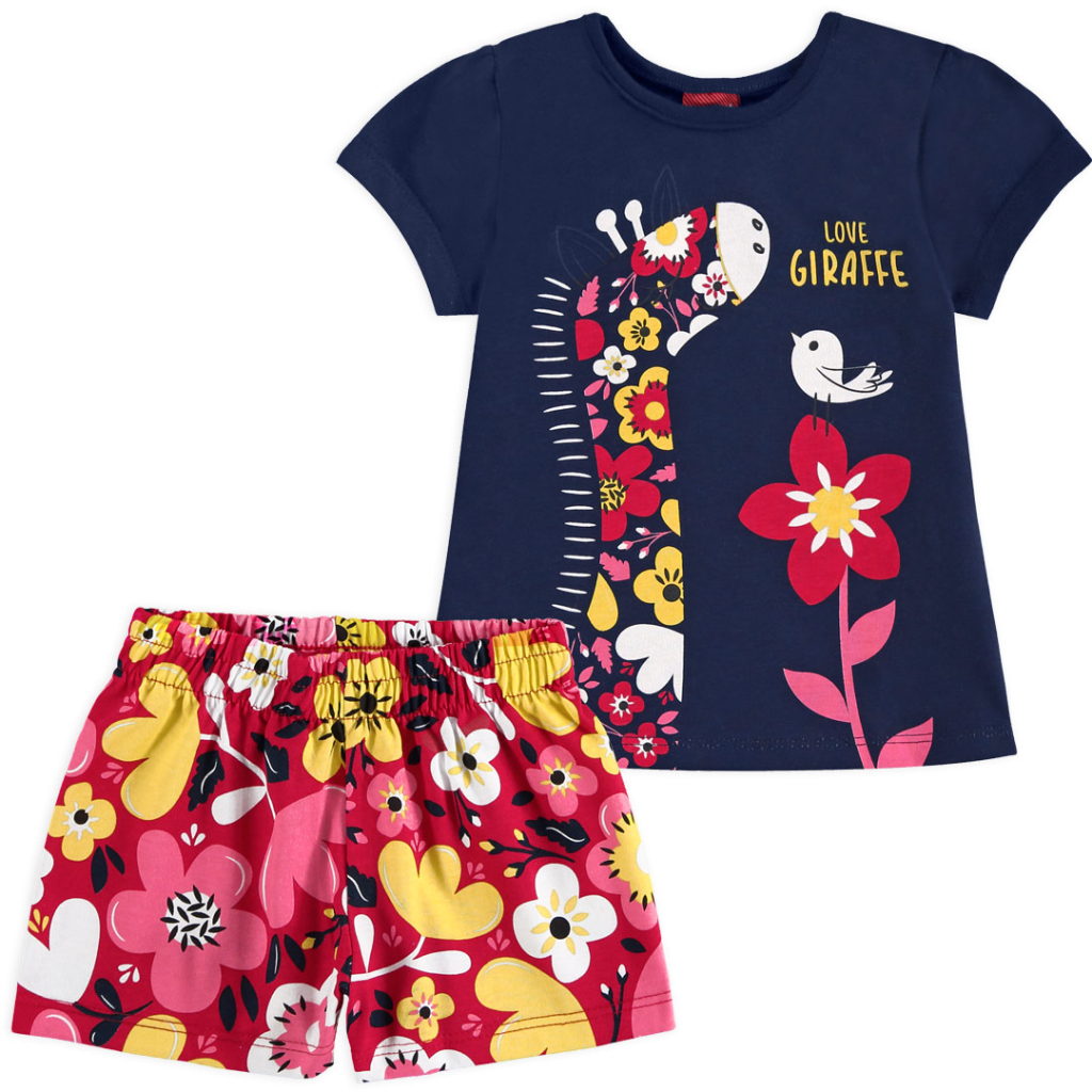 Krásna letná súprava pre dievčatá. Tričko s krátkym, mierne nazberaným rukávom. Zľahka rozšírený strih. Pohodlné šortky v páse na gumu. Mäkký, príjemný materiál. Vyrobené v Brazílii.Dodatočné parametre