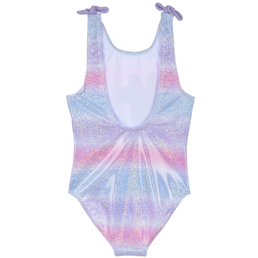 Krásne jednodielne plavky pre dievčatá. Farebný obrázok myšky Minnie na dúhovo farebnom podklade s potlačou drobných strieborných bodiek.
