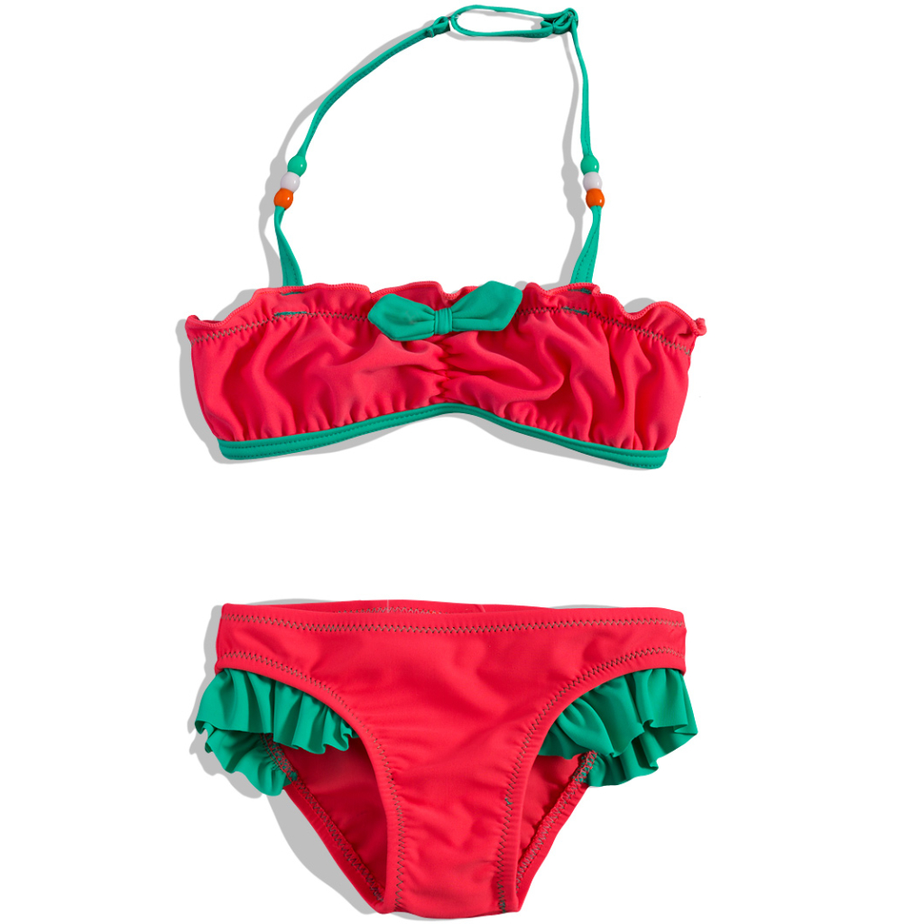Dievčenské dvojdielne plavky. Podprsenka bez zapínania, s riasením a ozdobnými korálkami. Ramienko za krk má nastaviteľnú dĺžku. Nohavičky s volánikom.