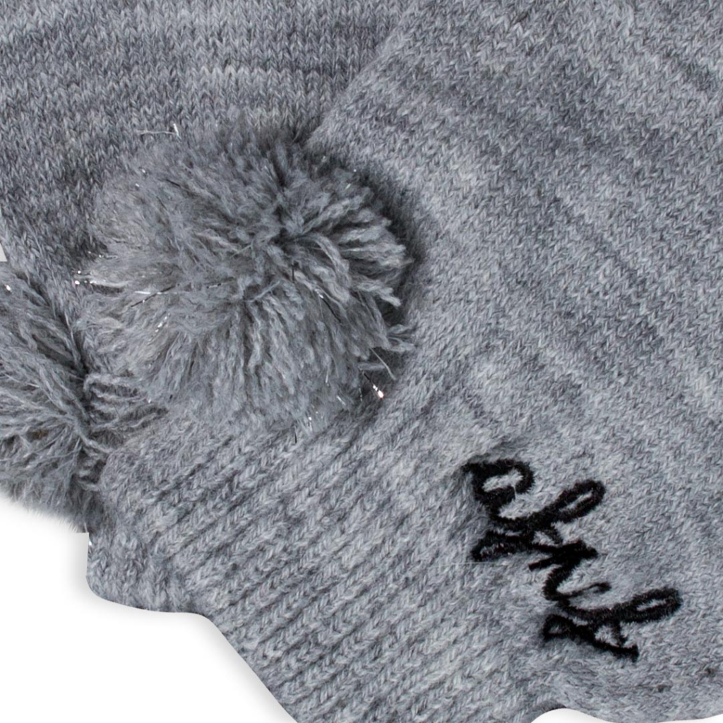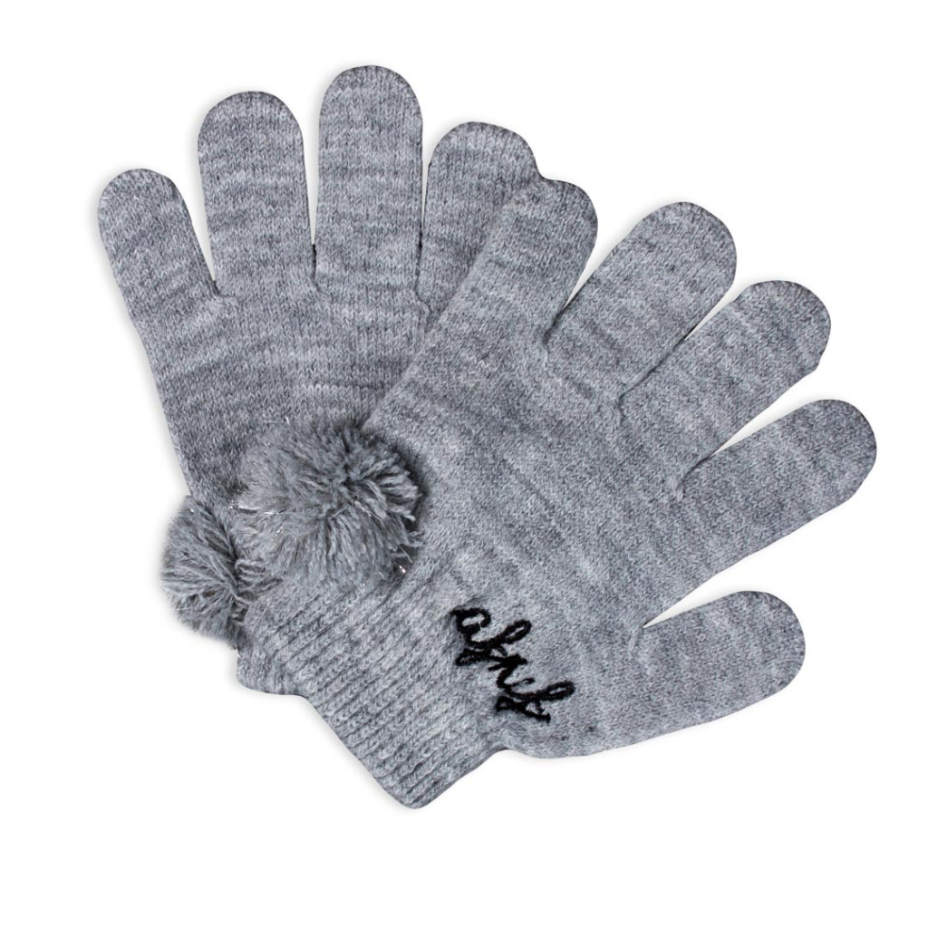 Dievčenské pletené rukavice. Vyšité logo značky. Malý brmbolec so striebornými vláknami. Dĺžka rukavíc od lemu po špičku prostredného prstu je 15cm.