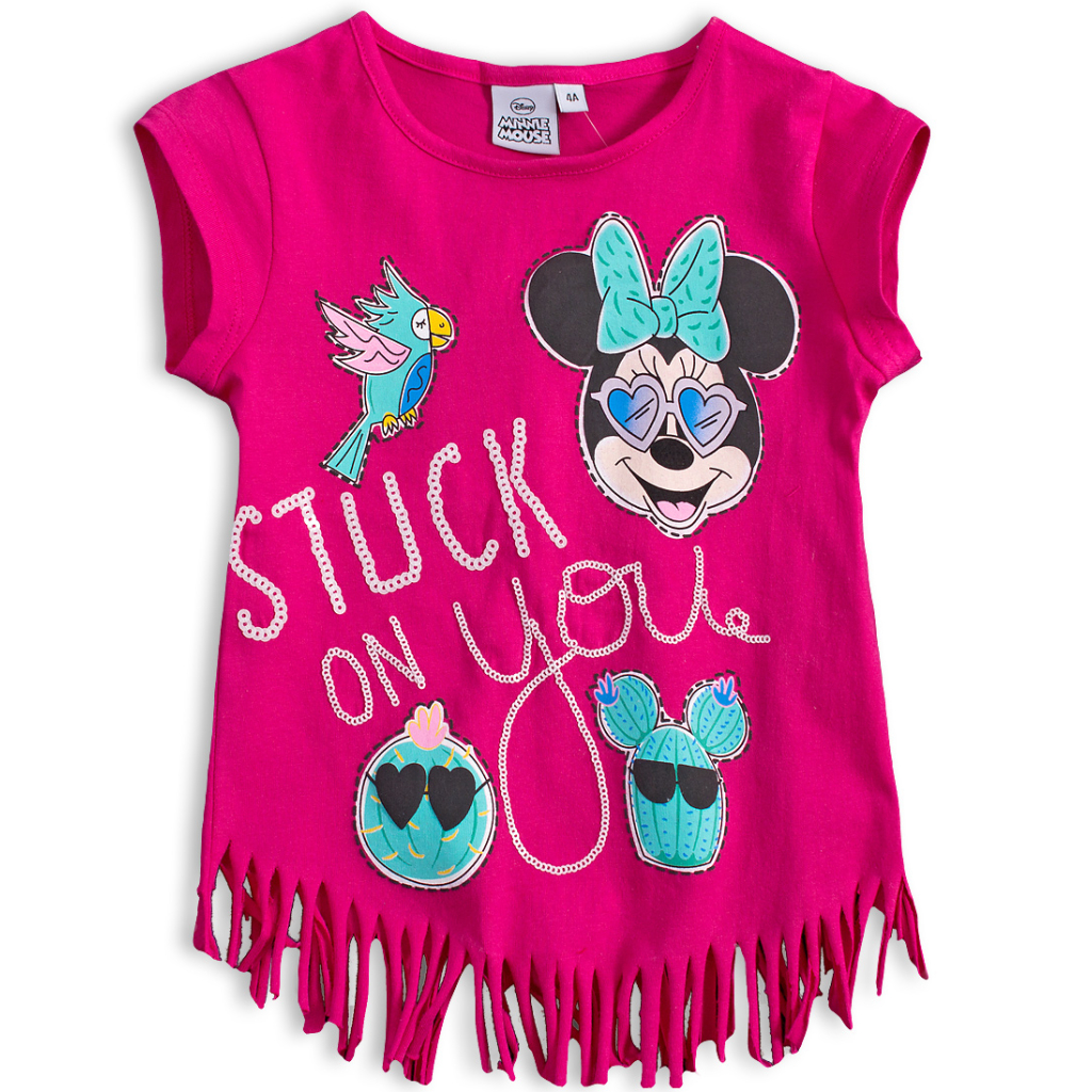 Perfektné dievčenské tričko s krátkym rukávom. Potlač Disney Minnie Mouse, nápis z flitrov. Strapce na spodnom okraji robia z trička parádny, originálny kúsok do šatníka.