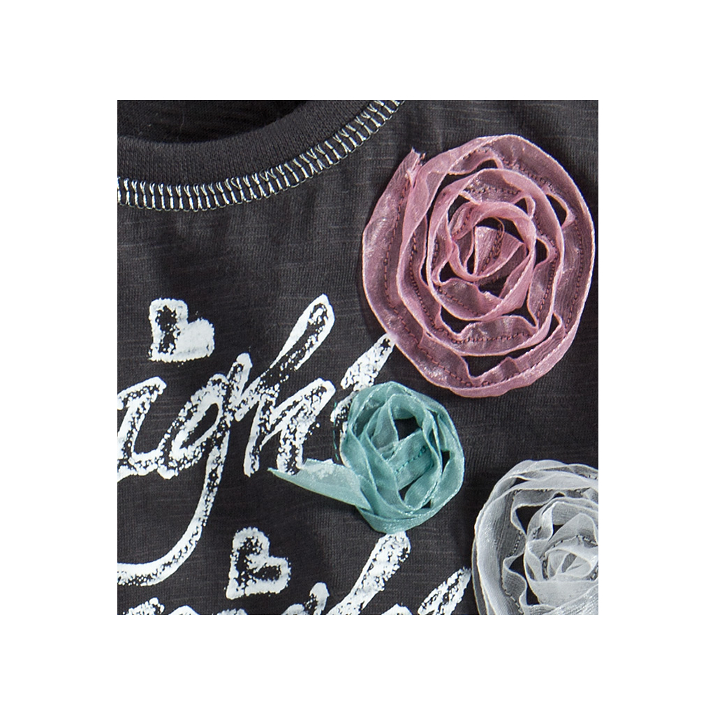 Dievčenské tričko s krátkym, nariaseným rukávom. Potlač, našitá aplikácia, ozdobné strieborné prešitie. Kvalitný bavlnený úplet.