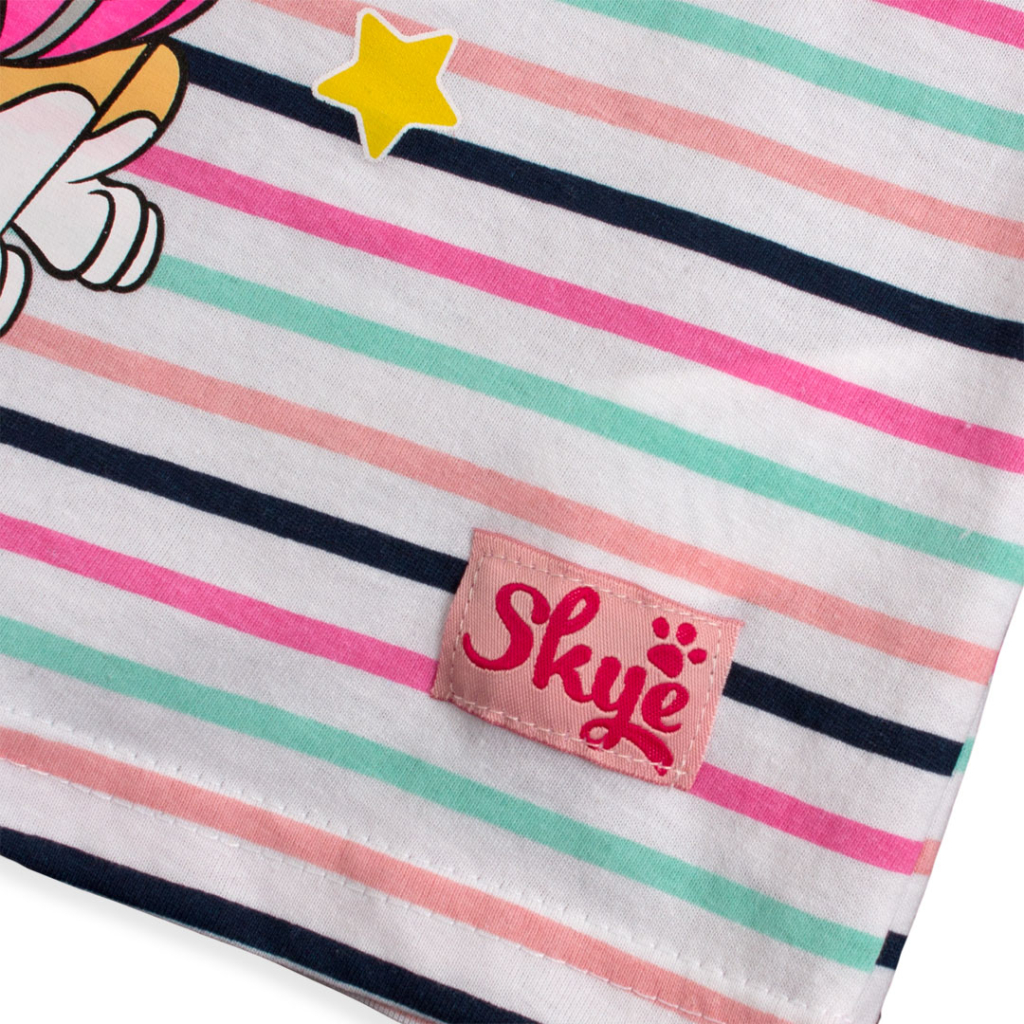 Dievčenské tričko s krátkym rukávom. Bavlnený úplet s farebnými prúžkami a krásnym obrázkom SKYE z Labkovej patroly.
