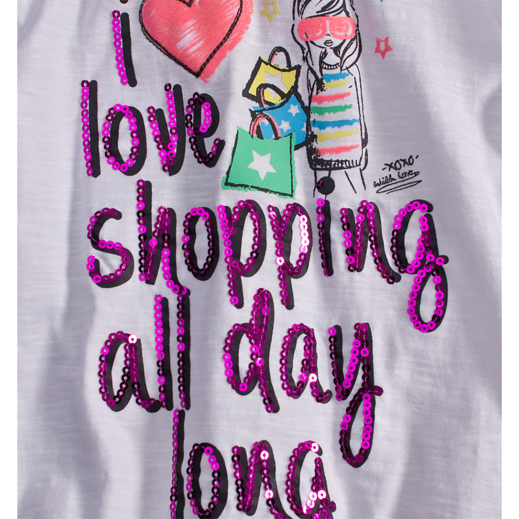 Dievčenské tričko s krátkym rukávom. Vyhrnuté rukávy, dole širší lem. Vpredu potlač, našité flitry. Príjemný, kvalitný bavlnený úplet.