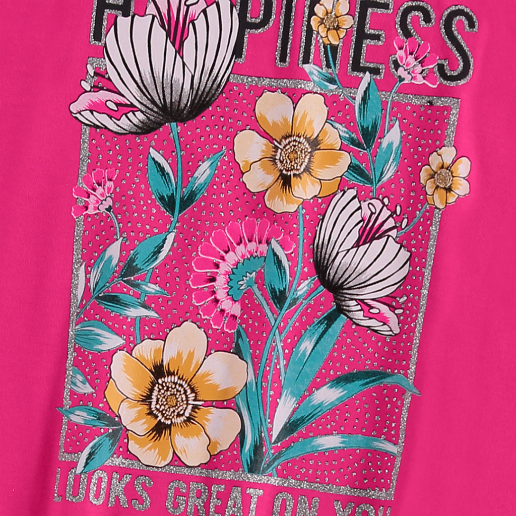 Dievčenská letná súprava. Tielko s potlačou, so striebornými detailmi, rozšírený strih. Pohodlné, pružné šortky, v páse na gumu. Vyrobené v Brazílii.