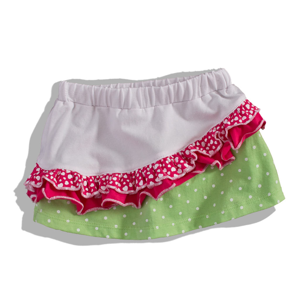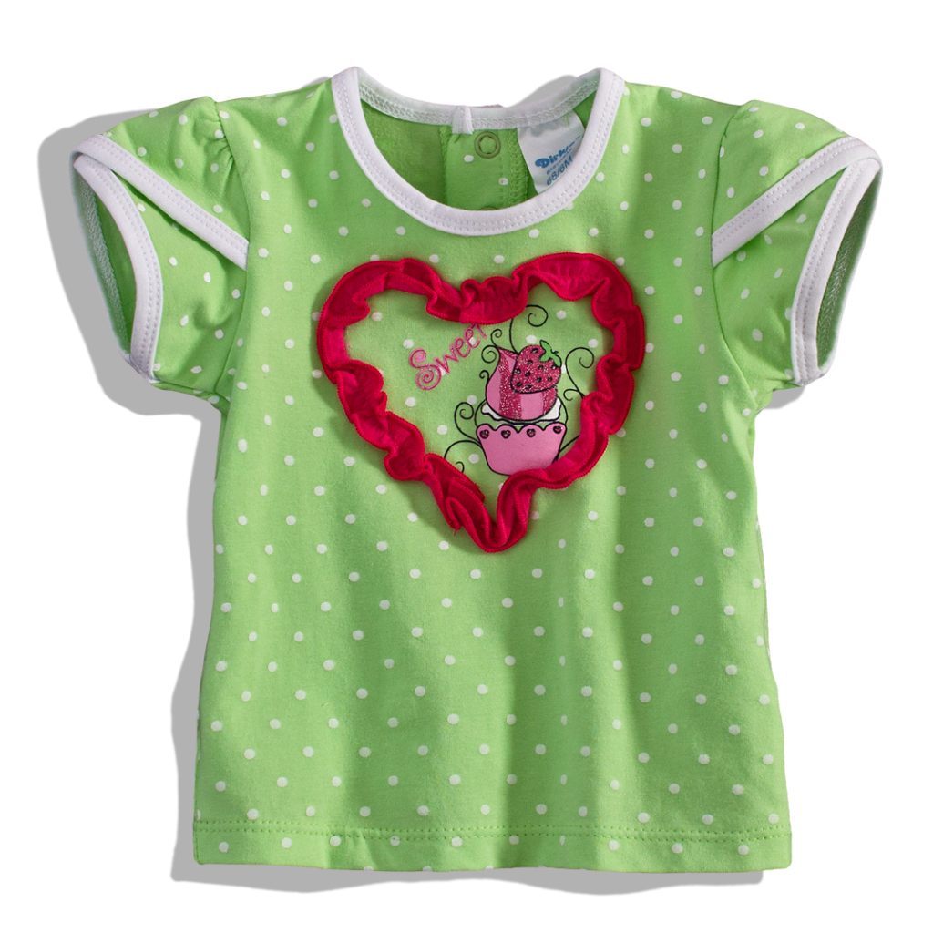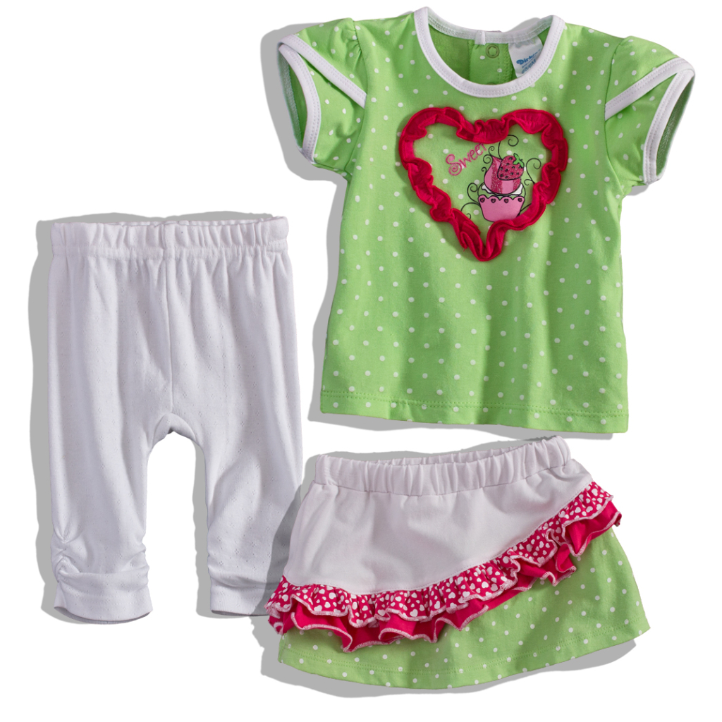 3-dielny komplet DIRKJE - tričko s krátkym rukávom, s potlačou a našitým srdiečkom. Zapínanie vzadu na patentky. Sukienka v páse na gumu, šikmo strihané diely, nazberané volániky. Legíny s nariasenými nohavicami